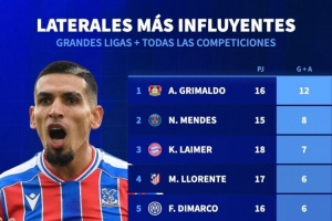 体育资讯11月25日讯 德国转会市场统计了本赛季五大联赛边卫的参与进球数量,并列出榜单,格里马尔多参与12球居首,努诺·门德斯参与8球次席。