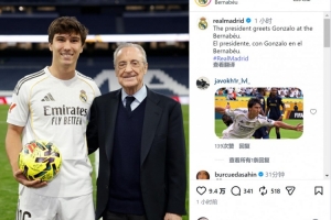 皇马主席弗洛伦蒂诺赛后与贡萨洛·加西亚合影,祝贺后者上演帽子戏法,皇马官方社媒晒出照片。